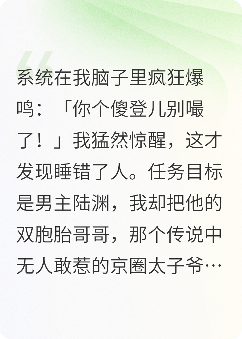 男女重点人物分别是【沈寂陆渊】的脑洞,豪门总裁,系统,甜宠,爽文小说《系统让我攻略太子爷,我却睡了他双胞胎哥哥》,由实力作家“爱吃猪尾巴的安以沫”创作,故事情节紧凑,引人入胜,本站无广告干扰,欢迎阅读!本书共计24657字,1章节,更新日期为2025-11-15。该作品目前在本网 【jcwdmf.com】上完结。小说详情介绍:系统让我攻略太子爷,我却睡了他双胞胎哥哥