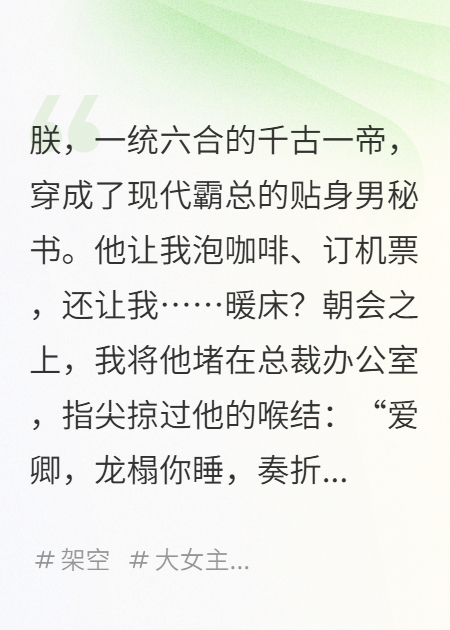 主角分别是【舟祈寒霖】的纯爱,架空,豪门总裁,职场小说《我,古代暴君,穿成霸总贴身男秘》,由知名作家“星空码农”倾力创作,讲述了一段扣人心弦的故事。本站TXT全本,期待您的阅读!本书共计10398字,1章节,更新日期为2025-11-15。该作品目前在本网 【jcwdmf.com】上完结。小说详情介绍:我,古代暴君,穿成霸总贴身男秘